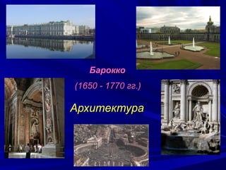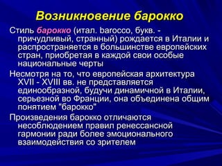 Барокко — это архитектурный стиль, возникший в Италии в 1650-1770 гг., характеризующийся эмоциональным взаимодействием со зрителем и динамизмом. Он сочетает в себе грандиозность, пышность, и эффектные зрелища с иллюзорными эффектами интерьеров, активно используя живопись и скульптуру. Архитектура барокко объединяет в себе идеи католицизма и абсолютизма, отличаясь сложностью форм и пространственными эффектами.