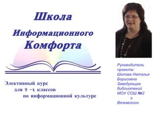 Документ представляет паспорт проекта элективного курса по информационной культуре для 9-х классов, предназначенного для формирования информационной культуры у школьников. Цель программы заключается в предпрофильном образовании и практической помощи в обучении основам информационной грамотности. Проект охватил 203 учащихся и 84 педагогов в городе Вяземском в период с 10.01.2006 по 31.12.2007.