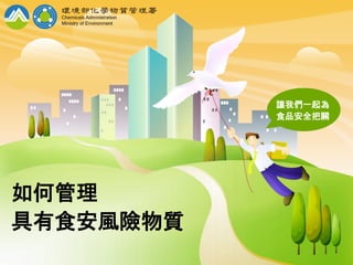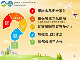 该文档详细介绍了食品安全风险物质的管理措施,包括针对57种风险物质的法律和政策。政府通过成立环境部化学物质管理署以及跨部会合作来加强食品安全和防止相关污染。此外,文档提到针对食安事件的严格标准和标示要求,以确保公众健康和安全。