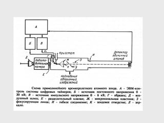 Документ описывает трансформацию потенциального барьера у поверхности металла под воздействием электрического поля и методы полевой электронно-эмиссионной микроскопии (ПЭЭМ) и полевой ионной микроскопии (ПИМ). Объясняются построения и характеристики изображений, получаемых с помощью ПЭЭМ, а также методы ионизации атомов вблизи металлических поверхностей. Приведены примеры изображений молекул, адсорбированных на вольфрамовой игле, и обсуждаются аспекты разрешения и потенциала в этих микроскопах.