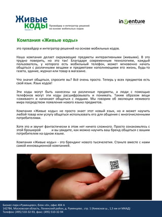 Компания 'Живые коды' является провайдером и интегратором решений на основе мобильных кодов, позволяя пользователям взаимодействовать с окружающими предметами через мобильные телефоны. Их технологии мобильного тегирования позволяют передавать информацию и осуществлять различные действия, такие как просмотр видео или отправка сообщений, простым считыванием кодов. Основное применение мобильных кодов происходит в рекламе, маркетинге и других сферах бизнеса, обеспечивая интеграцию данных и улучшая взаимодействие с клиентами.