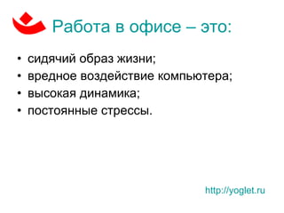 Документ описывает влияние сидячего образа жизни и стресса на здоровье сотрудников, приводя экономические потери от заболеваний, вызванных офисной работой. Предлагается решение проблемы через программу 'йоглет', которая включает онлайн-тренера и регулярно рекомендует физические упражнения. Экономические выгоды от внедрения подобной программы могут составить более 8 миллионов долларов для компании с 77 тысячами сотрудников.