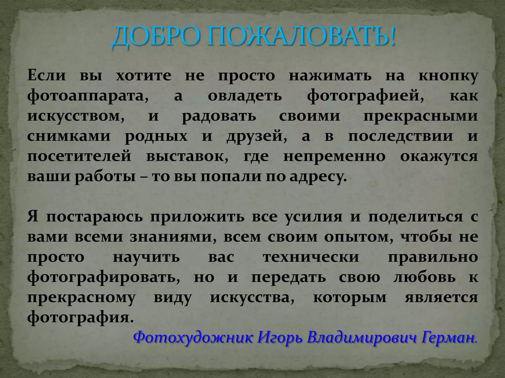 Презентация учебного курса фотографа Игоря Владимировича Германа нацелена на обучение тонкостям фотографии как искусства, включая историю, теорию, композицию и техники съемки. Учащиеся смогут освоить навыки работы с освещением, различными жанрами фотосъемки и основами обработки изображений, а также научатся создавать презентации и газеты. Основное внимание уделяется гармонии композиции и выразительности фотографий, чтобы участники могли успешно демонстрировать свои работы на конкурсах и выставках.