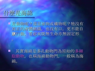 什麼是海綿 是動物呢?還是植物或礦物呢?牠沒有真正的身體組織,也沒有口,更不能自由行動,看起來既無生命亦無固定形狀。 其實海綿是多孔動物門為原始的