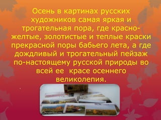 Документ представляет собой описание картин русских художников, изображающих осень, акцентируя внимание на их стиле и эмоциональном содержании. Работы, такие как 'Золотая осень' И. Левитана и 'Дары осени' А. Герасимова, демонстрируют прекрасные осенние пейзажи с использованием ярких и теплых цветов, а также ощущения ностальгии и меланхолии, характерные для этого времени года. Осень в этих картинах становится символом перехода, красоты природы и человеческих чувств.