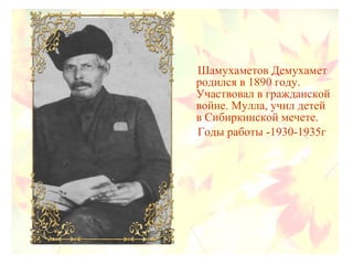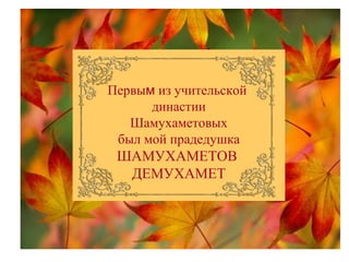 Документ описывает учительскую династию шамухаметовых и барыевых, начиная с прадедушки и продолжая через несколько поколений. Члены семьи внесли значительный вклад в образование, работая учителями и руководителями образовательных учреждений. Общее педагогическое стаж этой династии на 2013 год составляет 211 лет.