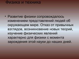 Документ описывает историческое развитие физики и техники, подчеркивая, как открытия в физике способствовали технологическому прогрессу и изменению представлений о мире. Основное внимание уделяется личности Исаака Ньютона и его вкладу в создание основ механики. Также отмечается, что дальнейшее развитие физики связано с изучением тепловых и электромагнитных явлений.