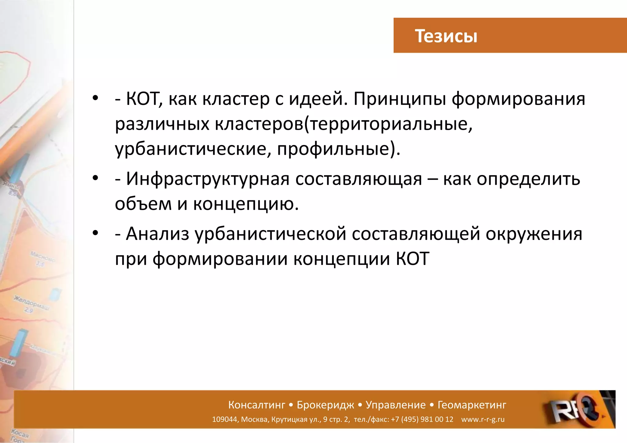 Документ обсуждает концепцию кластерного деления в урбанистике, подчеркивая важность создания инфраструктуры для комфортной жизни и работы в пределах определенных территорий. Он исследует принципы формирования кластеров, а также анализирует коммерческую инфраструктуру и население в контексте кластерного подхода. Основная идея заключается в том, что создание необходимых условий жизни снижает необходимость покидать территорию, что способствует повышению качества жизни.