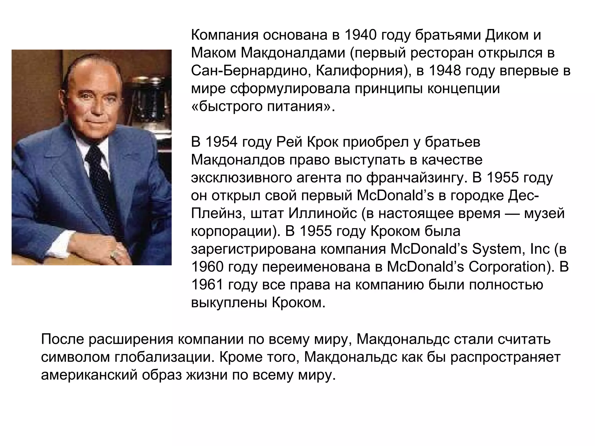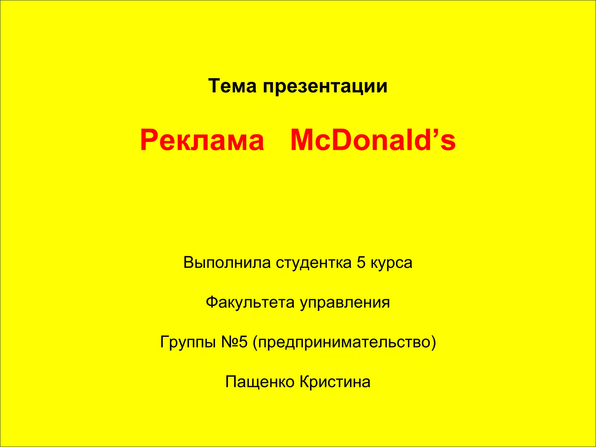 Презентация студента о рекламе McDonald's охватывает историю компании, начиная с ее основания в 1940 году и развития концепции 'быстрого питания'. Одной из ключевых тем является рекламная стратегия компании, которая включает инновационные и креативные кампании, такие как реклама с гигантским яйцом и сотрудничество с моделью Хайди Клум. Также упоминаются благотворительные инициативы, проводимые McDonald's в поддержку детей с серьезными болезнями.