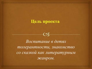 Документ описывает проект воспитания толерантности и литературных навыков у детей подготовительной группы через знакомство со сказками. В рамках проекта планируется развитие речи, творческих способностей и взаимодействие с родителями, а также организация мероприятий, таких как чтение, инсценировки и выставки. Ожидается, что дети начнут проявлять интерес к чтению и сохранять книги, а родители будут активнее читать сказки своим детям.