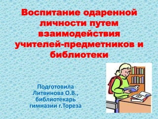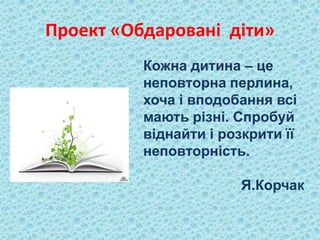 Документ рассматривает проект «Обдаровані діти», направленный на развитие одаренных детей через взаимодействие учителей и библиотеки. Содержит подробное описание различных модулей работы, включая мониторинг читательской активности, информационную деятельность и методическое сопровождение, а также примеры из жизни известных одарённых личностей. Также поднимается вопрос о читательских интересах и стимуляции творческой компетентности учащихся.
