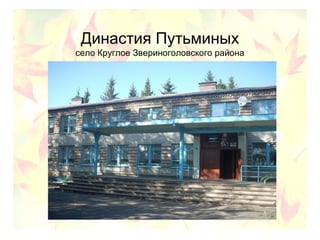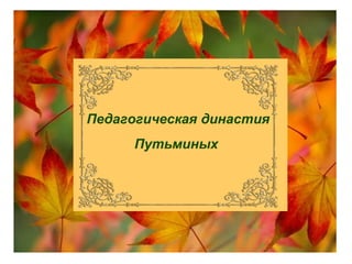 Документ рассказывает о педагогической династии семьи Путьминых, начиная с Раисы Фёдоровны, которая была учителем и заведующей школой, и заканчивая её дочерью Риммой и внучкой Светланой, продолжающими семейную традицию в образовании. За годы своей работы Раиса Фёдоровна заслужила признание, стала отличником народного просвещения и передавала свои знания, убеждая, что пример важен для воспитания детей. Спустя несколько поколений, династия продолжает развивать культурные и образовательные ценности, активно участвуя в жизни общества.