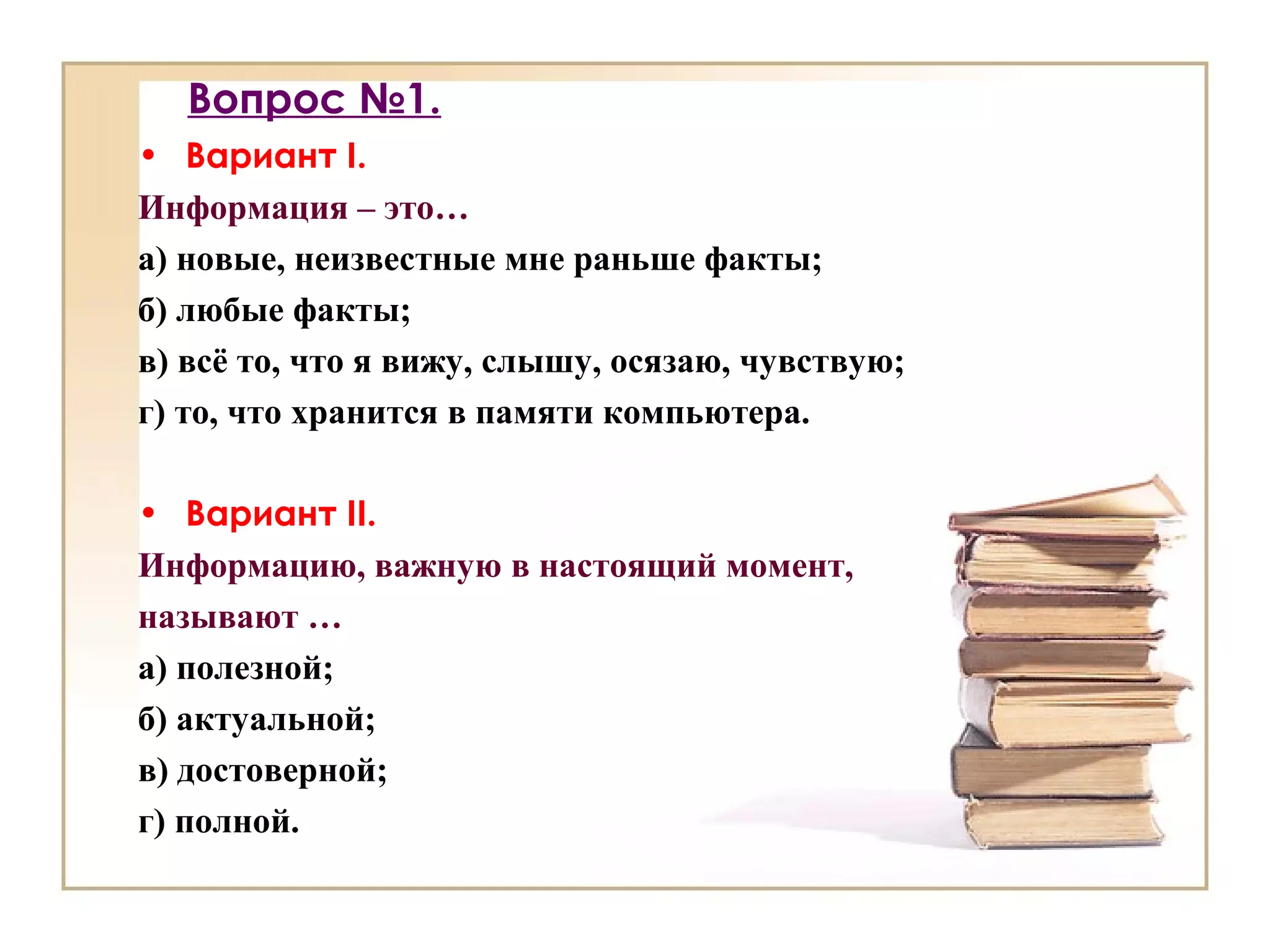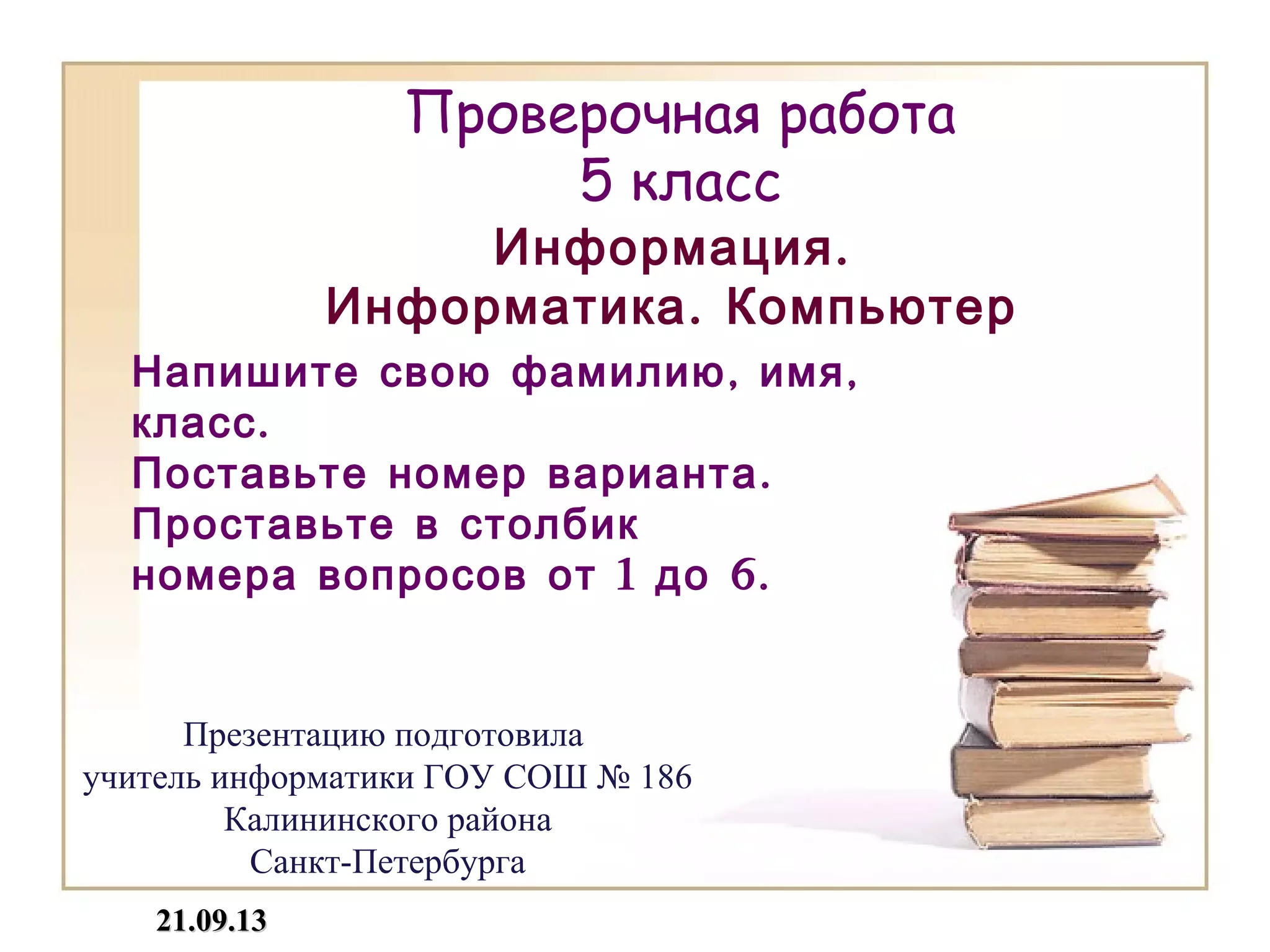 Документ представляет собой проверочную работу по информатике для 5 класса, в которой предлагаются различные вопросы о сущности и типах информации. Ученики должны выбрать правильные ответы из предложенных вариантов и оценить свои работы, используя критерии оценки. Преподаватель информатики подготовил материалы для проверки знаний, а также призывает учащихся к дальнейшему изучению предмета.