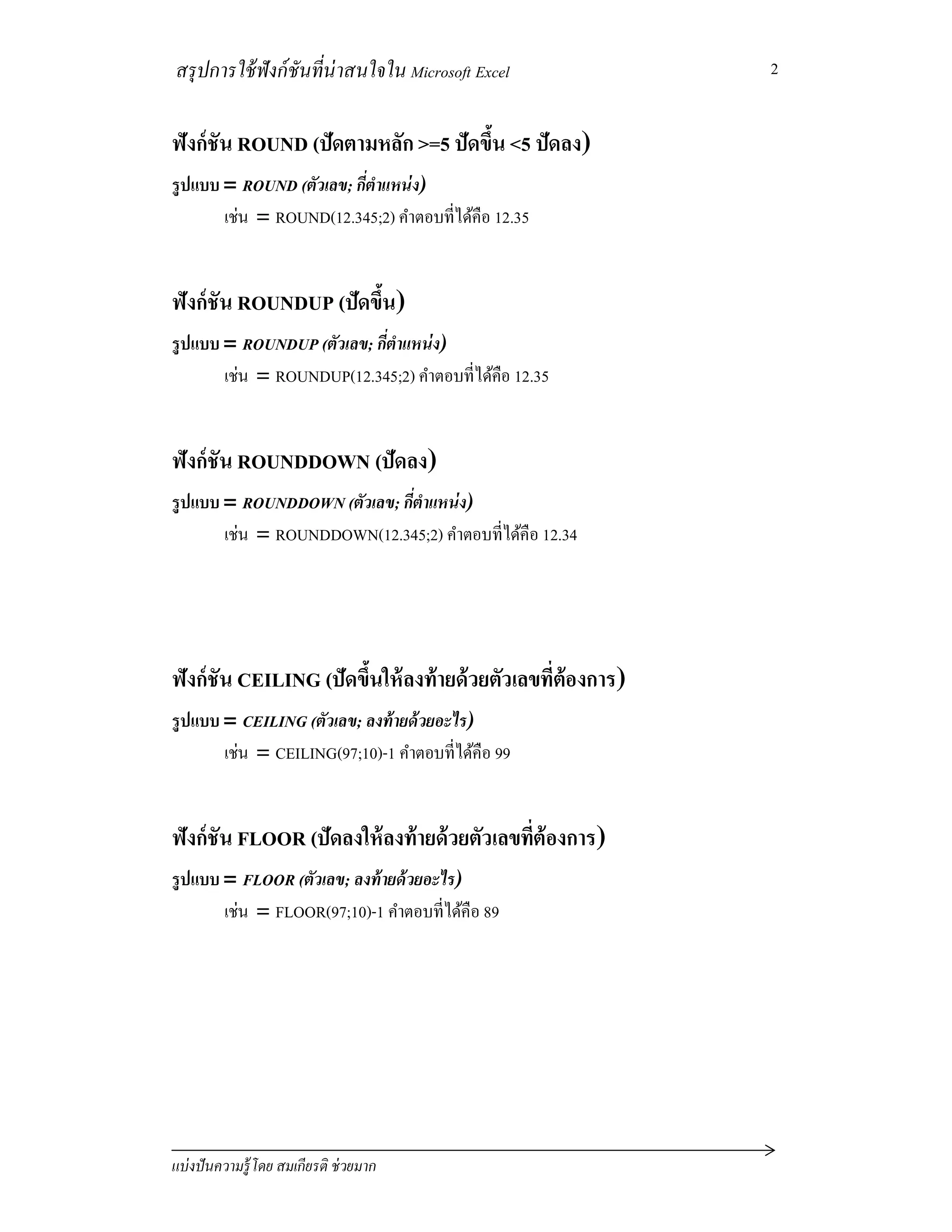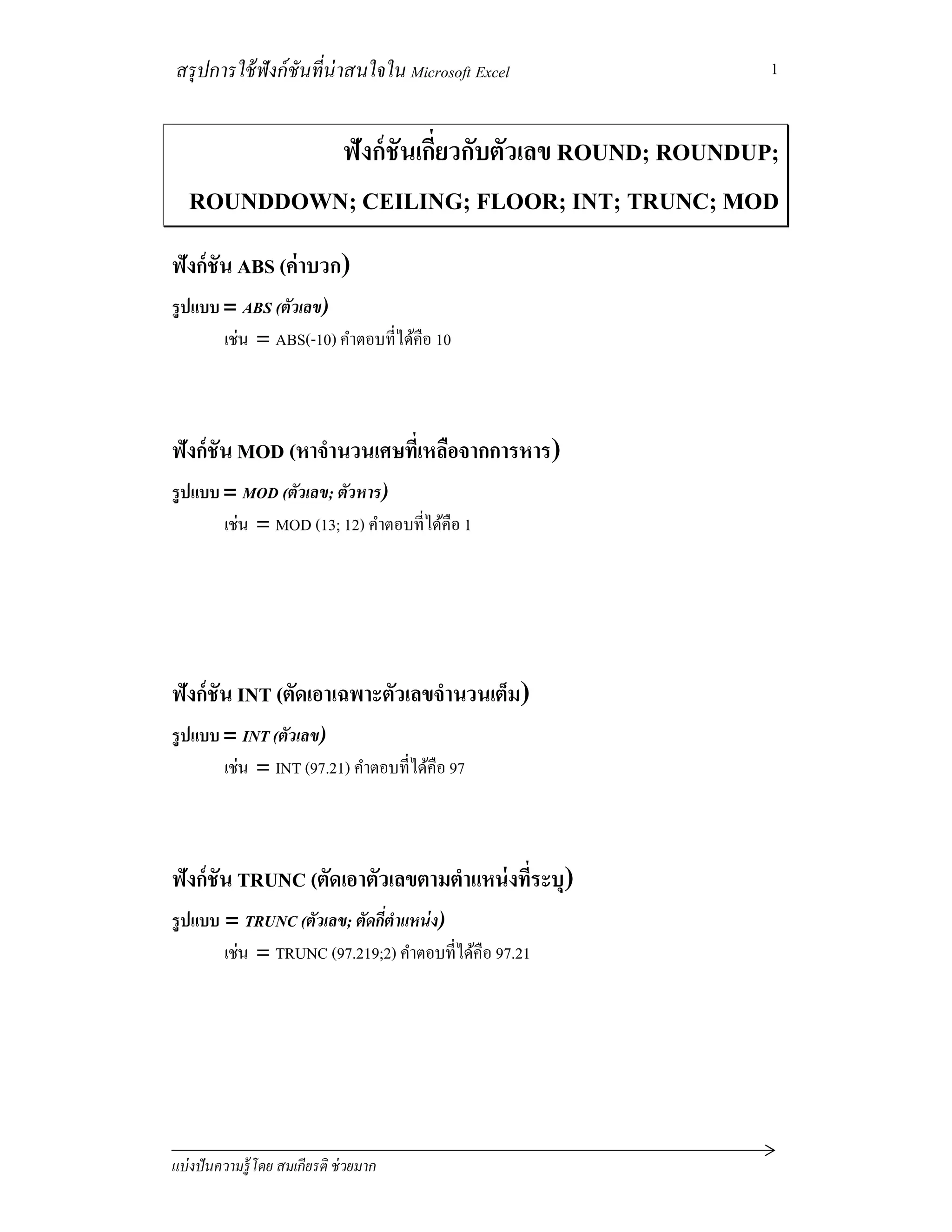 สมเกียรติ ช่วยมาก 1 ฟังก์ชันเกียวกับตัวเลข ROUND; ROUNDUP; ROUNDDOWN; CEILING; FLOOR; INT; TRUNC; MOD ฟังก์ชัน ABS (ค่าบวก) รูปแบบ = ABS (ตัวเลข) เช่น = ABS(-10) คําตอบทีได้คือ 10 ฟังก์ชัน MOD (หาจํานวนเศษทีเหลือจากการหาร) รูปแบบ = MOD (ตัวเลข; ตัวหาร) เช่น = MOD (13; 12) คําตอบทีได้คือ 1 ฟังก์ชัน INT (ตัดเอาเฉพาะตัวเลขจํานวนเต็ม) รูปแบบ = INT (ตัวเลข) เช่น = INT (97.21) คําตอบทีได้คือ 97 ฟังก์ชัน TRUNC (ตัดเอาตัวเลขตามตําแหน่งทีระบุ) รูปแบบ = TRUNC (ตัวเลข; ตัดกีตําแหน่ง) เช่น = TRUNC (97.219;2) คําตอบทีได้คือ 97.21