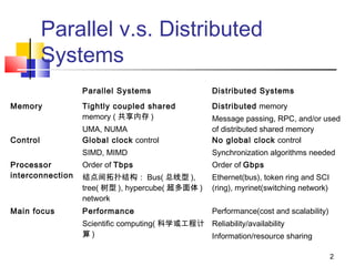 This document compares and contrasts parallel and distributed computing systems. Parallel systems have tightly coupled shared memory and global clock control, while distributed systems have distributed memory and no global clock. The milestones of distributed computing include time sharing systems in the 1960s-1970s, networks in the 1960s-1970s, minicomputers in the 1960s-early 1980s, and clusters and grid computing in the 1990s-present. Common system models are minicomputer, workstation, workstation-server, processor pool, cluster, and grid computing models.