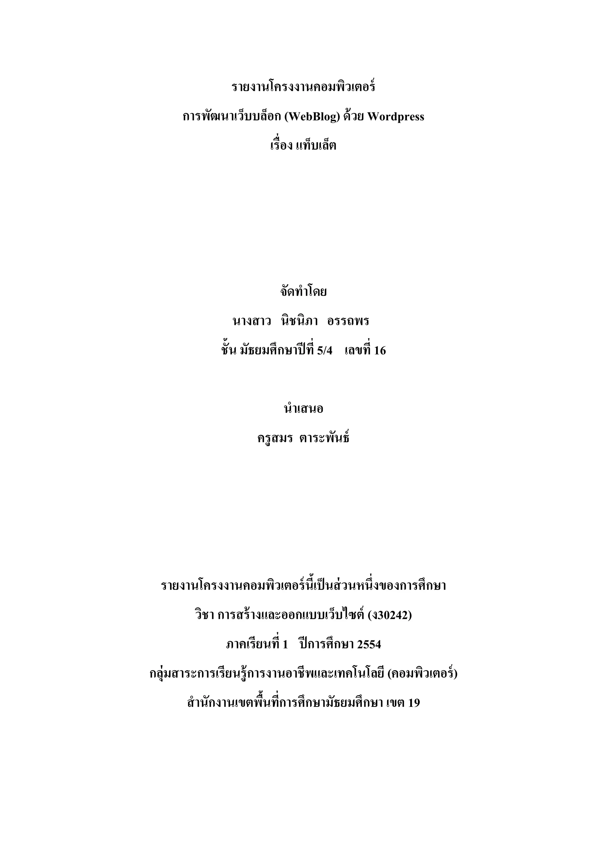 (WebBlog) ด้วย Wordpress เรื่อง แท็บเล็ต ประเภทของโครงงาน : โครงงานพัฒนาสื่อเพื่อการศึกษา ผู้เสนอโครงงาน : นางสาวนิชนิภา อรรถพร ชั้นมัธยมศึกษาปีที่ 5/4 เลขที่ 16 ครูที่ปรึกษาโครงงาน : นางสมร ตาระพันธ์ ตาแหน่ง ครูชานาญการพิเศษ ปีการศึกษา : 2554 บทคัดย่อ โครงงานการพัฒนาเว็บบล็อก (WebBlog) ด้วย Wordpress เรื่องแท็บเล็ต นี้ จัดทาขึ้นโดยมี วัตถุประสงค์เพื่อนาเอารูปแบบการเรียนรู้ยุคใหม่ที่ใช้สื่อสังคม หรือ Social Media ซึ่งเป็นสื่อที่ได้รับความ สนใจและเป็นที่นิยมในปัจจุบัน มาประยุกต์เข้ากับการเรียนรู้ โดยได้ศึกษารูปแบบและพัฒนาการเรียนรู้ใน การจัดสร้างเว็บบล็อกด้วยเว็บไซต์สาเร็จรูปชื่อว่า Wordpress ทั้งนี้ได้ทาการศึกษาค้นคว้าเนื้อหาความรู้ที่ สนใจเกี่ยวกับเรื่อง แท็บเล็ต คือ คอมพิวเตอร์พกพาหรือคอมพิวเตอร์ที่สามารถใช้งานขณะเคลื่อนที่ได้ขนาด กลางที่มีหน้าจอแบบสัมผัสในการใช้งานเป็นหลัก โดยผู้จัดทาโครงงานสามารถพัฒนารูปแบบของเว็บ บล็อกจาก Wordpress ได้ด้วยตนเองและนามาประยุกต์ใช้ให้เข้ากับการเรียนรู้ของตนเองมากยิ่งขึ้น และได้ และนาเสนอผ่านทางเว็บบล็อกที่ http://nitnipajoy.wordpress.com ทั้งนี้ ทาให้สามารถติดต่อสื่อสารกันได้ ระหว่างครู เพื่อนและผู้สนใจทั่วไปได้เป็นอย่างดี