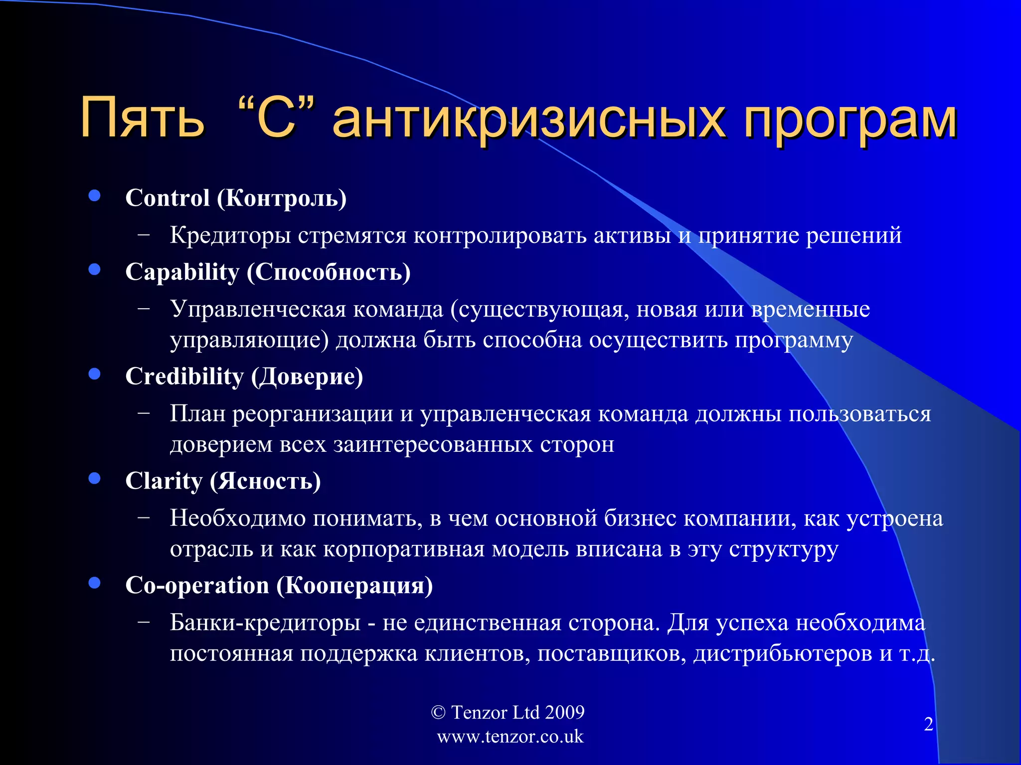 Документ описывает антикризисные программы и их важность для банков и компаний, акцентируя внимание на пяти ключевых аспектах: контроль, способность, доверие, ясность и кооперация. Он также рассматривает значение цепей поставок и рабочий капитал, подчеркивая, что компании могут выживать благодаря здоровым цепям поставок, даже если отдельные компании имеют проблемы. Важно понимать, как распределены риски и прибыли в цепи поставок, а также как можно адаптировать бизнес-модель для минимизации риска.