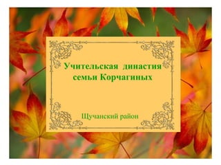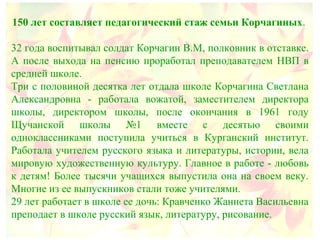 Династия педагогов семьи Корчагиных на протяжении 150 лет вкладывает свои усилия в образование, начиная с полковника в отставке Василия Михайловича и продолжая его детьми и внуками. Члены семьи работали учителями русского языка, литературы и истории, включая Светлану Александровну, которая за свою карьеру выпустила более тысячи учеников, и Жаннету Васильевну, которая преподает 29 лет. Несмотря на трудности профессии, семья продолжает гордиться своей работой и любовью к детям.