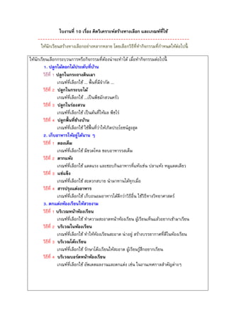คิดวิเคราะห์สร้างทางเลือก และเกณฑ์ที่ใช้ -------------------------------------------------------------- ให้นักเรียนสร้างทางเลือกอย่างหลากหลาย โดยเลือกวิธีที่ทากิจกรรมที่กาหนดให้ต่อไปนี้ ให้นักเรียนเลือกกระบวนการหรือกิจกรรมที่ต้องน่าจะทาได้ เมื่อทากิจกรรมต่อไปนี้ 1. ปลูกไม้ดอกไม้ประดับที่บ้าน วิธีที่ 1 ปลูกในกระถางดินเผา เกณฑ์ที่เลือกใช้ ... พื้นที่มีจากัด ... วิธีที่ 2 ปลูกในกระบะไม้ เกณฑ์ที่เลือกใช้ ...เป็นพืชผักสวนครัว วิธีที่ 3 ปลูกในร่องสวน เกณฑ์ที่เลือกใช้ เป็นต้นที่ให้ผล พืชไร่ วิธีที่ 4 ปลูกพื้นที่ข้างบ้าน เกณฑ์ที่เลือกใช้ ใช้พื้นที่ว่าให้เกิดประโยชน์สูงสุด 2. เก็บอาหารให้อยู่ได้นาน ๆ วิธีที่ 1 ดองเค็ม เกณฑ์ที่เลือกใช้ มีขวดโหล ชอบอาหารรสเค็ม วิธีที่ 2 ตากแห้ง เกณฑ์ที่เลือกใช้ แดดแรง และชอบกินอาหารที่แห้งเช่น ปลาแห้ง หมูแดดเดียว วิธีที่ 3 แช่แข็ง เกณฑ์ที่เลือกใช้ สะดวกสบาย นามาทานได้ทุกเมื่อ วิธีที่ 4 สารปรุงแต่งอาหาร เกณฑ์ที่เลือกใช้ เก็บถนอมอาหารได้ดีกว่าวิธีอื่น ใช้วิธีทางวิทยาศาสตร์ 3. ตกแต่งห้องเรียนให้สวยงาม วิธีที่ 1 บริเวณหน้าห้องเรียน เกณฑ์ที่เลือกใช้ ทาความสะอาดหน้าห้องเรียน ผู้เรียนเห็นแล้วอยากเข้ามาเรียน วิธีที่ 2 บริเวณในห้องเรียน เกณฑ์ที่เลือกใช้ ทาให้ห้องเรียนสะอาด น่าอยู่ สร้างบรรยากาศที่ดีในห้องเรียน วิธีที่ 3 บริเวณโต๊ะเรียน เกณฑ์ที่เลือกใช้ รักษาโต๊ะเรียนให้สะอาด ผู้เรียนรู้สึกอยากเรียน วิธีที่ 4 บริเวณบอร์ดหน้าห้องเรียน เกณฑ์ที่เลือกใช้ อัพเดตผลงานและตกแต่ง เช่น ในงานเทศกาลสาคัญต่างๆ