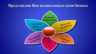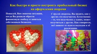Документ предлагает идею бизнеса на оформлении шарами, которая требует минимальных вложений и может приносить значительный доход. Он описывает разные направления услуг, такие как оформление свадеб и праздников, и предлагает два подхода к началу бизнеса: самостоятельный опыт или обучение на чужом успешном опыте. Также предлагается видео-курс по аэродизайну с обучающими материалами.