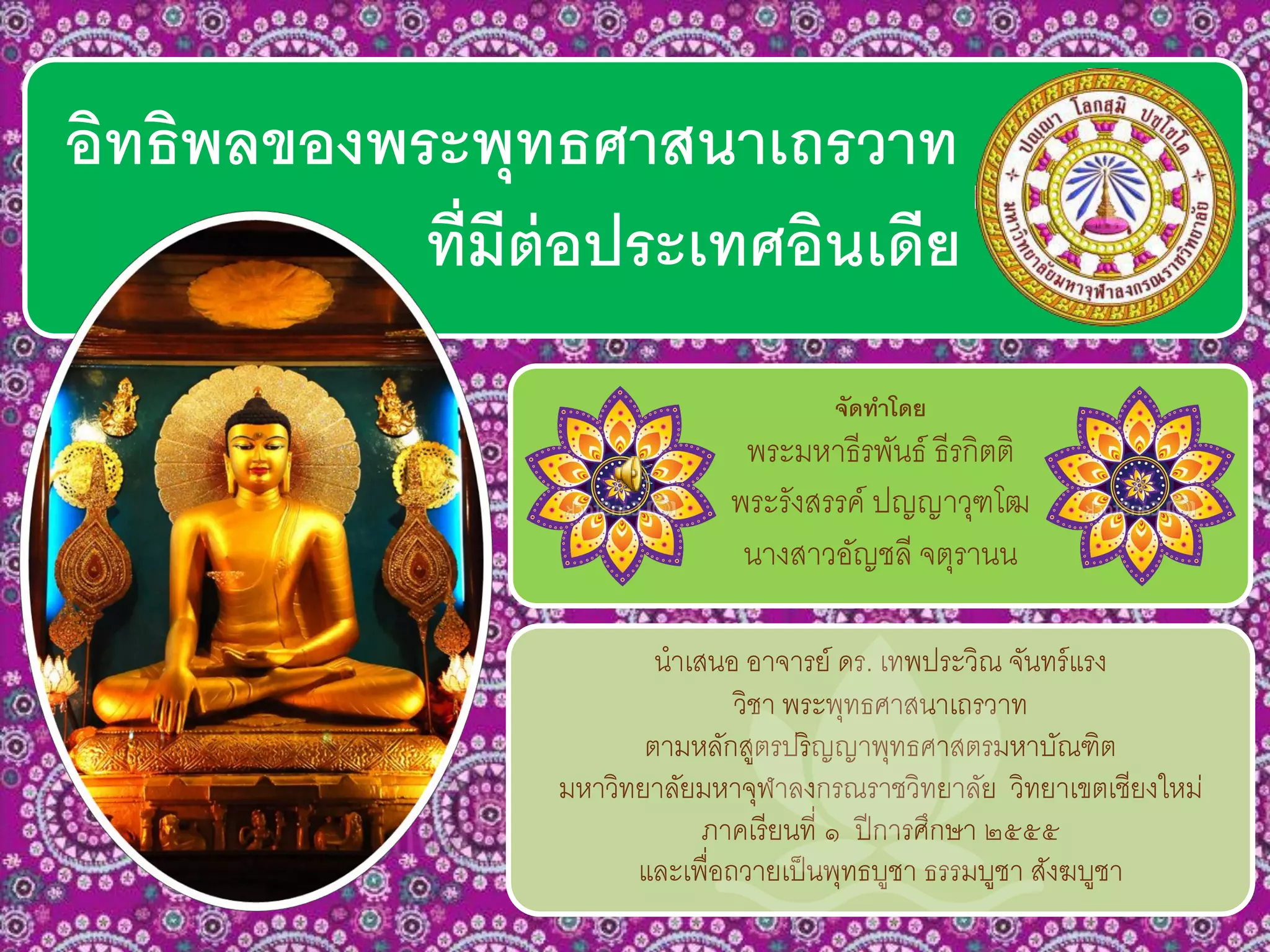 เป็นตัวอย่างในการนาคาสอน ของพระพุทธเจ้ามาเป็นหลักในการดาเนินชีวิต อิทธิพลพุทธศาสนาเถรวาทในอินเดีย ช่วงปี พ.ศ. ๒๔๐๐ – พ.ศ. ๒๕๐๐ พ.ศ. ๒๕๑๕ - ผลงานนักปราชญ์ชาวอินเดีย รพินทรนาถ ฐากูร - มีบทบาทในการให้นานา ประเทศเข้าใจกันยิ่งขึ้น ยวาหระลาล เนรูห์ - เทิดทูนพระพุทธเจ้าว่าเป็นผู้ ประเสริฐที่สุดในอินเดีย ทั้ง ๓ มหาบุรุษนี้ได้สดุดี พระพุทธเจ้าในหนังสือ Buddha As Seen By Three Illustrious Sons Of India (พระพุทธเจ้า ในทัศนะของสามรัตนะ บุรุษของอินเดีย)