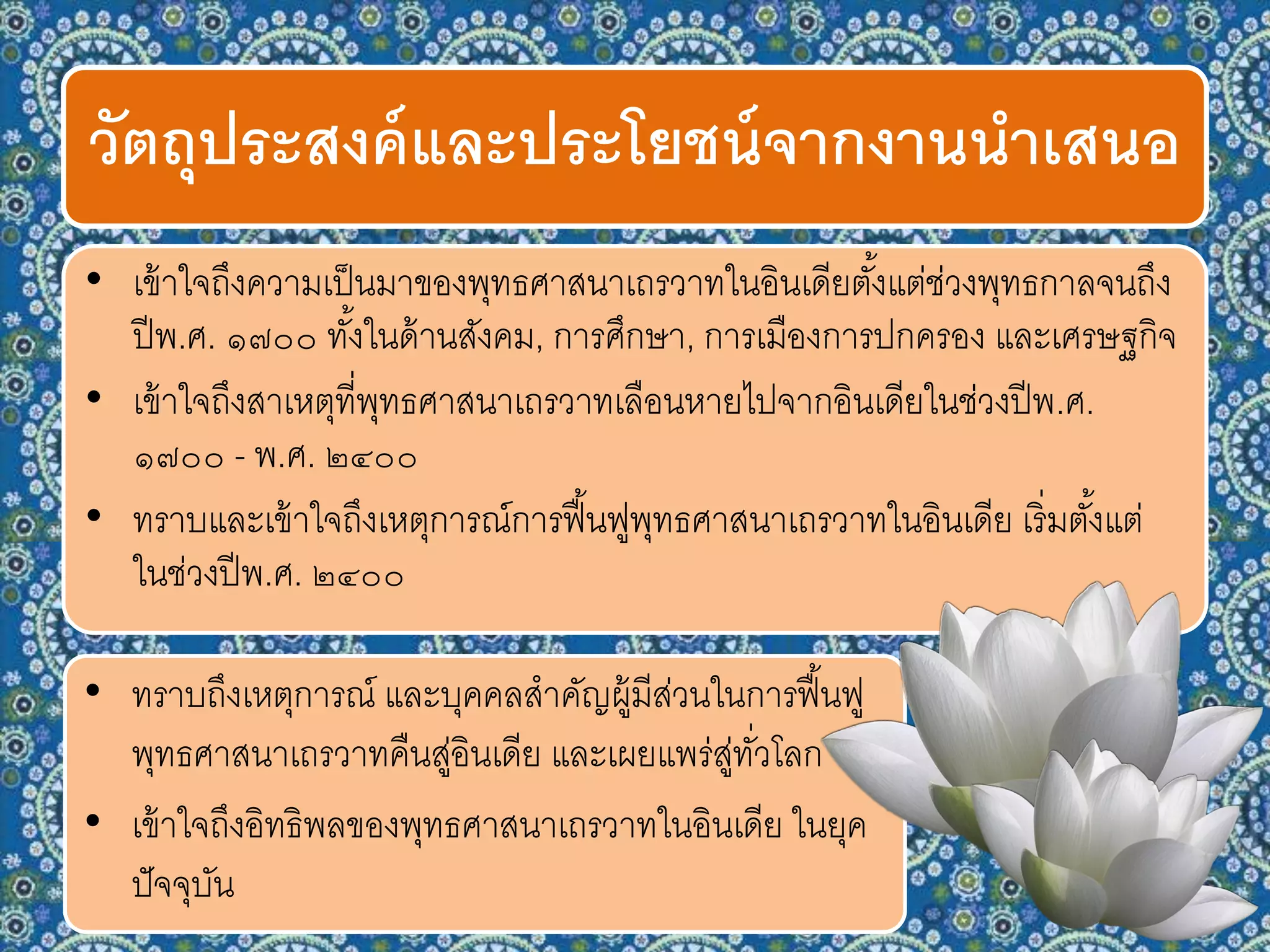 มหาธีรกิตฺติภิกฺขุ ปญฺญาวุฑฺฒภิกฺขุ อญฺชลี นาม มหาอุปาสิกา จาติ มย กลฺยาณจิตฺ เตน รตนตฺตยานุภาว อาทิสฺส เทวปวีนาจริยสฺส จ สพฺเพส มหาปณฺฑิตานญฺจ ปสิทฺธิวร ททาม อนุโมทาม ตุมฺเห จ สิกฺขาปาร ปปฺโปถ ฯ รตนตฺตยานุภาเวน รตนตฺตยเตชสา ยญฺจ โข สกฺกต โหติ เอตสฺสานุภาวโต อโรคา โหถ นิทฺทุกฺขา นิสฺโสกา อกุโตภยา สมคฺคา จ พลูเปตา ทกฺขา กิจฺจปยุญฺชเน อิทฺธึ ปปฺโปถ เวปุลฺล วิรุฬฺหึ จุตฺตรึ สทา ฯ โสตฺถิ ภนฺเต อนุโมทามิ สาธุ สาธุ สาธุ ฯ ดาวน์โหลดไฟล์งานนาเสนอนี้และวิชาอื่นๆได้ที่ www.BuddhaBucha.net/download ส่วนในที่สุดแห่งการกล่าวนาเสนองานนี้ ข้าพเจ้าทั้งหลาย คือ พระมหาธีรพันธ์ ธีรกิตฺติ พระรังสรรค์ ปญฺญาวุฑฺโฒ และนางสาวอัญชลีขอตั้งกัลยาณจิตอ้างอิงคุณพระศรีรัตนไตร ให้พรกล่าวขอขอบคุณ อาจารย์ ดร.เทพประวิณ และพระนิสิตมหาบัณฑิตทั้งหลาย ขอให้ พวกท่านทั้งหลายจงถึงฝั่งแห่งการศึกษาเทอญ ด้วยอานุภาพและตบะเดชะของพระรัตนไตร บุญกุศลใดแลที่ท่านทั้งหลายได้กระทา ด้วยอานุภาพแห่งบุญนั้น ขอให้ท่านทั้งหลาย จงเป็นผู้ไม่มีโรค ไม่มีทุกข์ ไม่มีความโศกเศร้า ไม่มีภัยทั้งภายในและภายนอก เป็นผู้รักใคร่ สามัคคีกัน มีพละกาลังแกร่งกล้าสามารถและเป็นผู้ขยันในการงานที่จะพึงทา จงได้ถึงความเจริญรุ่งเรืองไพบูลย์ แผ่ไพศาลยิ่งๆขึ้นไปเทอญ ขอสวัสดี ขอบพระคุณท่านทั้งหลาย สาธุ ๆ ๆ ๆ ฯ