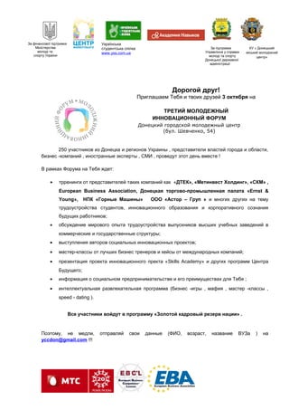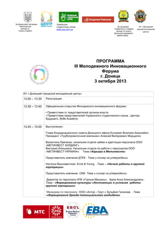 3 октября в Донецком городском молодежном центре пройдет третий молодежный инновационный форум, где ожидается участие 250 участников из Донецка и регионов Украины, включая представителей бизнеса и власти. В программе форума предусмотрены тренинги по трудоустройству, обсуждение мирового опыта, мастер-классы и презентации инновационных проектов, таких как "skills academy". Участники также смогут поучаствовать в развлекательной программе и войдут в программу "золотой кадровый резерв нации".
