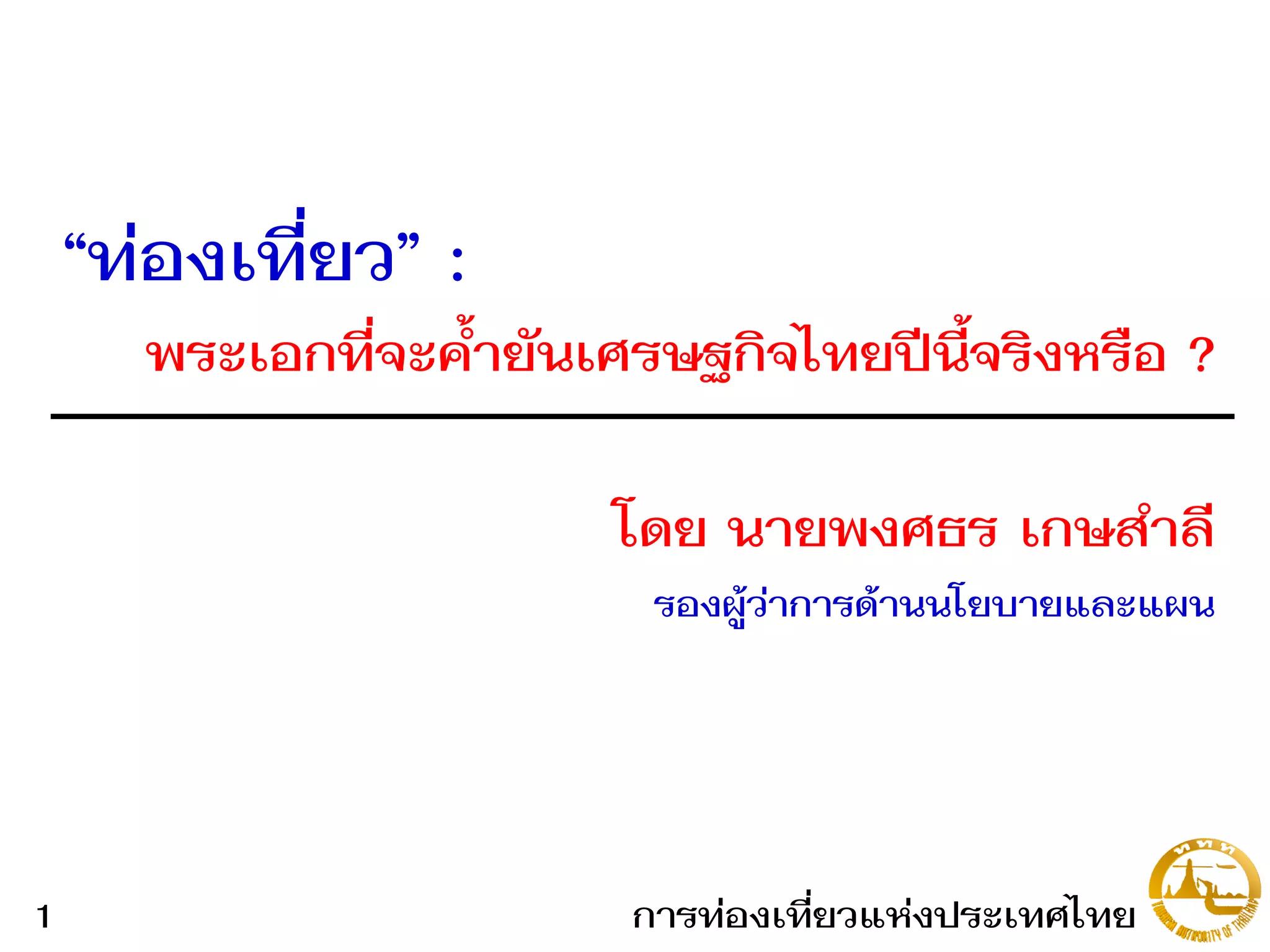 เอกสารประกอบการนำเสนอผลโพล“ท่องเที่ยว : พระเอกที่จะค้ำยันเศรษฐกิจไทยปีนี้จริงหรือ?" เมื่อวันที่ 30 กันยายน 2556 ณ การท่องเที่ยวแห่งประเทศไทย โดยนายพงศธร เกษสำลี รองผู้ว่าการด้านนโยบายและแผน