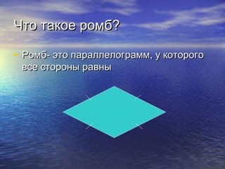Документ описывает свойства и характеристики ромба, включая его определение, признаки, формулы для расчета периметра и площади. Также приводятся задачи для закрепления материала и интересные факты о ромбе, включая его применение в жизни и даже в сказочном контексте. В конце документа указаны ссылки на дополнительные ресурсы по теме.
