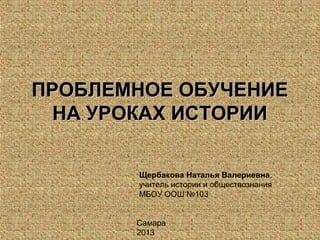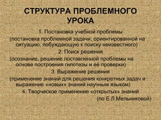 Документ описывает структуру проблемного обучения на уроках истории, выделяя ключевые этапы, такие как постановка учебной проблемы, поиск решения, выражение и творческое применение знаний. Приводятся примеры тем уроков, их содержание и выводы учащихся о значении самоуправления и равенства перед законом в средневековом городе. Также упоминаются используемые литературные источники для дальнейшего изучения темы.