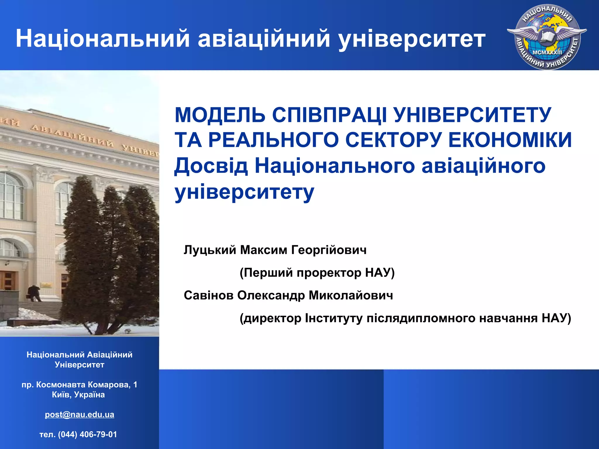 Луцький Максим Георгійович(Перший проректор НАУ) Савінов Олександр Миколайович (директор Інституту післядипломного навчання НАУ) МОДЕЛЬ СПІВПРАЦІ УНІВЕРСИТЕТУ ТА РЕАЛЬНОГО СЕКТОРУ ЕКОНОМІКИ Досвід Національного авіаційного університету Національний авіаційний університет Національний Авіаційний Університет пр. Космонавта Комарова, 1 Київ, Україна [email_address] тел. (044) 406-79-01