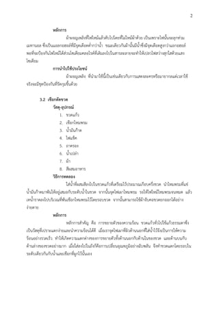 ฯลฯ 3.3 น้าเปลี่ยนสี วัสดุ-อุปกรณ์ 1. กระป๋องพลาสติก 3 ใบ 2. สายพลาสติกขนาดเส้นผ่านศูนย์กลาง 1 เซนติเมตร ยาว 12 เซนติเมตร จานวน 3 เส้น 3. ถ้วยแก้วพลาสติกขนาด 180 มิลลิลิตร 3 ใบ 4. บีกเกอร์ขนาด 250 มิลลิลิตร 2 ใบ 5. สีผสมอาหาร 3 สี ได้แก่ สีแดง สีเหลือง สีเขียว 6. น้าเปล่า วิธีทดลอง เทน้าเปล่าลงไปในภาชนะใบที่ 1 ให้น้าไหลออกจากสายพลาสติกสู่ภาชนะใบที่ 2, 3 และ 4 ตามลาดับ โดยสังเกตที่สายพลาสติกที่ต่อออกจากภาชนะแต่ละใบรวมทั้งภาชนะรองรับใบสุดท้ายว่า น้าที่ไหนมีสีอะไร เมื่อเทน้าเปล่าลงไปในภาชนะใบที่ 1 จะมีน้าสีแดงไหลออกมาทางสายพลาสติก ลงไปใน ภาชนะใบที่ 2 จากนั้นจะมีน้าสีเหลืองไหลลงสู่ภาชนะใบที่ 3 ท้ายที่สุดจะมีน้าสีเขียวไหลลงไปในภาชนะ รองรับใบที่ 4 หลักการ ใช้หลักการทางวิทยาศาสตร์เกี่ยวกับการแทนที่ของน้า ในภาชนะแต่ละใบจะมีน้าสี ต่างๆ อยู่ในภาชนะแล้ว และมีภาชนะรองรับน้าอีกชั้นหนึ่งภายในเมื่อน้าไหลลงในภาชนะภายในจะทาให้น้าที่ เติมไว้ไหลออกมาแทน การน้าไปใช้ประโยชน์ นาไปใช้ในการหาปริมาตรของวัตถุรูปทรงต่างๆ ที่เราต้องการรู้ 4. การน้าหลักการทางวิทยาศาสตร์มาใช้ 3.1 ผ้าผจญเพลิง ผ้าผจญเพลิงที่ไฟไหม้แล้วดับไปโดยที่ไม่ไหม้ผ้าด้วย เป็นเพราะไฟนั้นจะลุกท่วมเมทานอล ซึ่ง เป็นแอลกอฮอล์ ขณะเดียวกันผ้านั้นมีน้าพอที่จะป้องกันไฟไหม้ได้ส่วนโซเดียมคลอไรด์ที่เติมลงไปใน สารละลายจะทาให้เปลวไฟสว่างสุกใสด้วยแสงโซเดียม 3.2 เชือกตัดขวด หลักการสาคัญ คือ การขยายตัวของความร้อน ขวดแก้วทั่วไปใช้แก้วธรรมดาซึ่งเป็นวัสดุที่ เปราะแตกง่ายและนาความร้อนได้ดี เมื่อเราจุดไฟเผาที่ผิวด้านนอกที่ใส่น้าไว้จึงเป็นการให้ความร้อนอย่าง