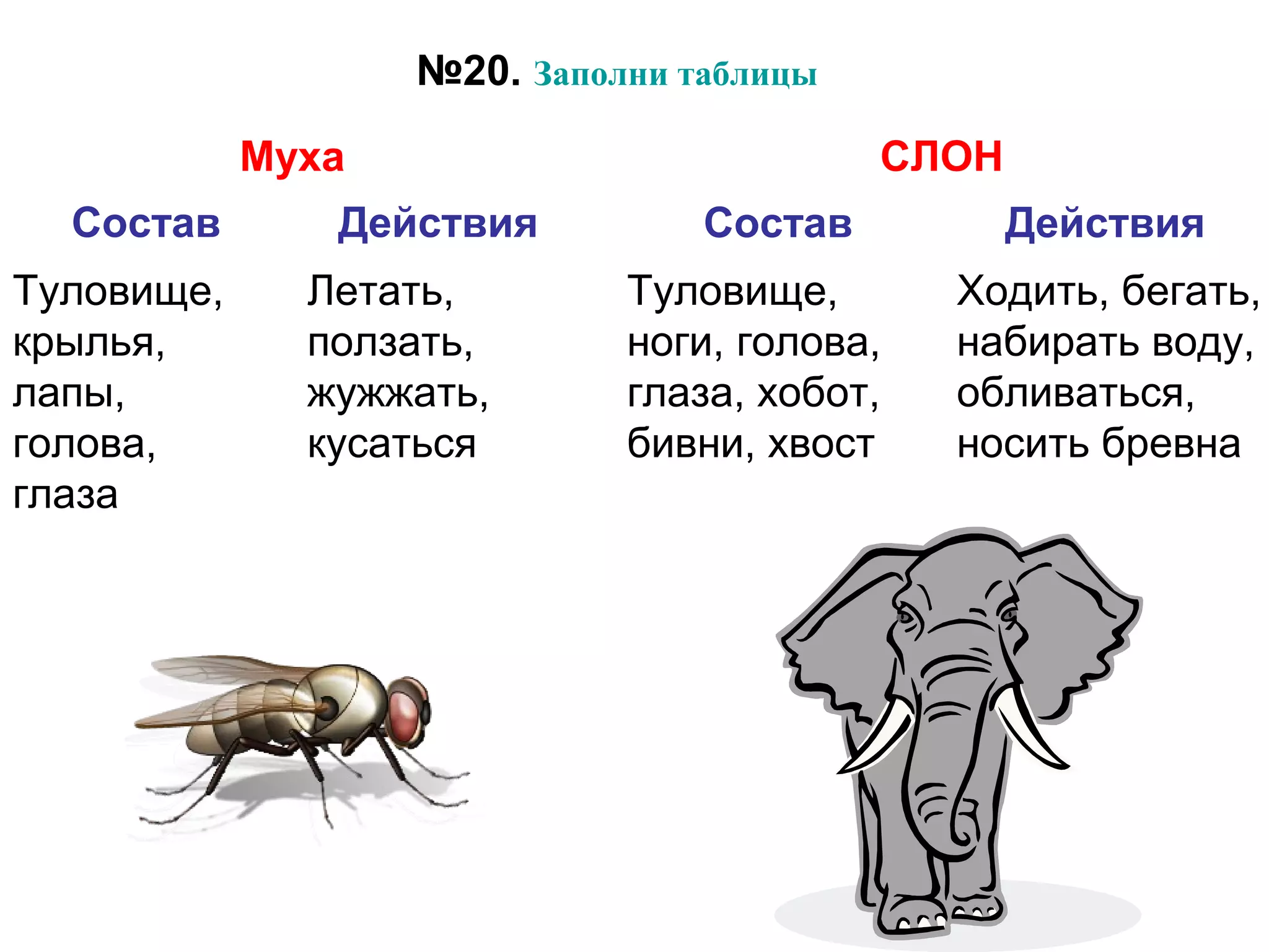 Документ представляет собой подготовку к контрольной работе по информатике для 4 класса, в которой излагаются задания на заполнение таблиц и создание рисунков, связанных с действиями и признаками животных и предметов. Также представлены обратные алгоритмы для выполнения различных действий, таких как уборка в классе и чистка ковра. В документе акцентируется внимание на классификации действий и соответствующих признаков, а также на визуализации этих понятий.
