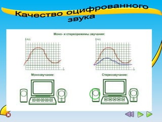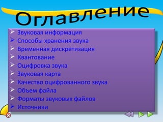 Документ описывает основные аспекты звуковой информации, включая способы ее хранения, оцифровку и качество звука, а также различные форматы звуковых файлов. Указаны параметры, такие как частота, амплитуда и уровни громкости, а также процессы, связанные с аналоговым и цифровым хранением звука. В заключение, документ перечисляет примеры форматов звуковых файлов и их характеристики.