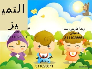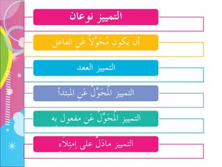 تناقش المحاضرة مفهوم التمييز في اللغة العربية، موضحة أنواع التمييز المنصوبة وأهميتها في إيضاح المعاني. يتم ذكر كيفية استخدام التمييز بشكل صحيح في الجمل، بالإضافة إلى تقديم أمثلة توضيحية للأساليب النحوية المختلفة. يُعتبر التمييز عنصراً أساسياً للتعبير الدقيق في اللغة.