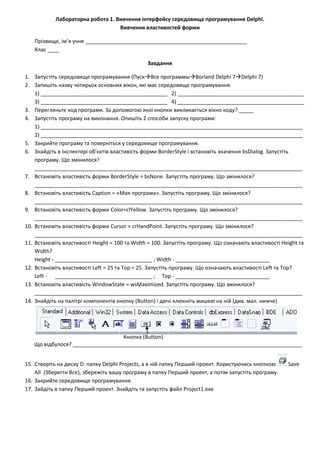 Лабораторна робота 1.Вивчення інтерфейсу середовища програмування Delphi.