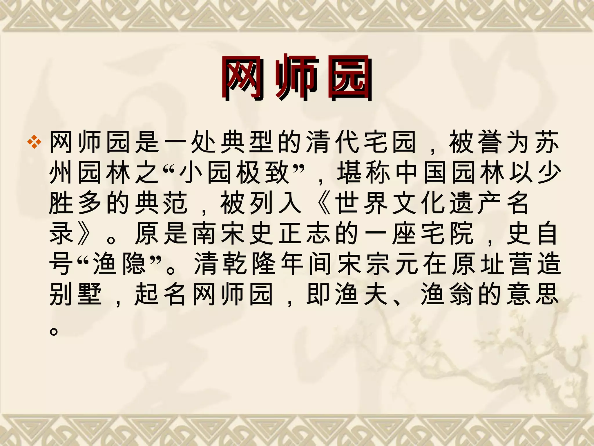 文档介绍了苏州的著名园林,如网师园、留园、虎丘、寒山寺、狮子林及拙政园,强调其历史、建筑艺术及文化价值。多个园林被列入世界文化遗产和国家重点文物保护单位,凸显了苏州园林的传统与美学。文中还提及了其他重要景点与历史背景,展现了苏州丰富的文化遗产。