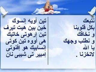 الوثيقة تتضمن صلوات وطلبات من أجل الرحمة والمغفرة، تعبر عن الإيمان والاعتماد على الرب. كما تشير إلى أهمية تقديم الصلوات والتضرع مع ذكر الشخصيات الدينية الهامة. يُختتم النص بالدعاء للقديسين ولطلب الغفران من الله.