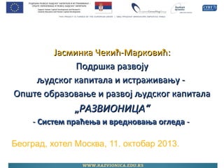Излагање Јасминке Чекић-Марковић на консултативном састанку са начелницима и саветницима из школских управа и саветницима из Завода за унапређивање образовања и васпитања, одржаном у београдском хотелу "Москва", 11. октобра 2013.