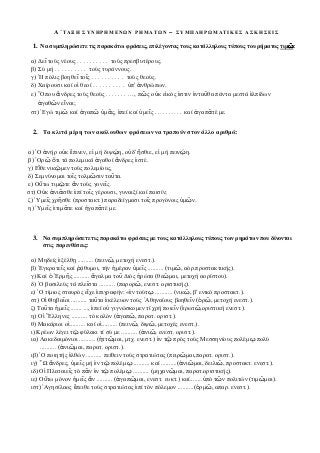 Να συµπληρώσετε τις παρακάτω φράσεις, επιλέγοντας τους κατάλληλους τύπους του ρήµατος τ鵫: « α) ∆ε› τούς νέους . . . . . . . . . . τούς πρεσβυτέρους. β) Σύ µή . . . . . . . . . . τούς τυράννους. γ) ÑΗ πόλις βοηθε› το›ς . . . . . . . . . . τούς θεούς. δ) Χαίρουσι καί οfl θεοί . . . . . . . . . . Íπ' éνθρώπων. ε) ÜΟπου êνδρες τούς θεούς . . . . . . . ..., π«ς οÈκ εfiκός §στιν §νταËθα πάντα µεστά §λπίδων éγαθ«ν ε‰ναι; στ) Εγώ τ鵫 καί éγαπ« ͵çς, §πεί καί Íµε›ς . . . . . . . . . . καί éγαπçτέ µε. 2. Τα κλιτά µέρη των ακόλουθων φράσεων να τραπούν στον άλλο αριθµό: α) ÑΟ éνήρ οÈκ ¶πινεν, εfi µή διψ–η, οÈδ' ≥σθιε, εfi µή πειν–η. β) ÑΟρ« ˜τι τά πολεµικά éγαθοί êνδρες §στέ. γ) Ε‡θε νικ“µεν τούς πολεµίους, δ) Σεµνύνοµαι το›ς το뵫σιν ταËτα. ε) ΟÏτω τ鵓τε êν τούς γονε›ς. στ) ΟÈκ éνιçσθε §πί το›ς γέρουσι, γυναιξί καί παισίν; ζ) ÑΥµε›ς χρ∞σθε (προστακτ.) παραδείγµασι το›ς προγόνοις ͵«ν. η) ÑΥµε›ς §τιµçτε καί ±γαπçτέ µε. 3. Να συµπληρώσετε τις παρακάτω φράσεις µε τους κατάλληλους τύπους των ρηµάτων που δίνονται στις παρενθέσεις: α) Μηδείς §ξέλθη+ .......... (πειν«, µετοχή ενεστ.). β) Εγκρατε›ς καί =ά+θυµοι, τήν ≤µέραν ͵ε›ς .......... (τ鵫, αόρ.προστακτικής). γ) Καί ı ÑΕρµ∞ς .......... êγαλµα τοË ∆ιός ±ρώτα (θε«µαι, µετοχή αορίστου). δ) ÑΟ βασιλεύς τά πλε›στα .......... (παρορ«, ενεστ. οριστικής). ε) ÑΟ τίµιος σταυρός ε‰χε §πιγραφήν: «§ν τούτƒ ........... (νικ«, β' ενικό προστακτ.). στ) Οfl Θηβα›οι .......... ταËτα §κέλευον τούς Αθηναίους βοηθε›ν (ıρ«, µετοχή ενεστ.). ζ) ΤαËτα ≤µε›ς ....... ..., §πεί οÈ γιγνώσκοµεν τί χρή ποιε›ν (§ρωτ«,οριστική ενεστ.). η) Οfl ÜΕλληνες .......... τό καλόν (éγαπ«, παρατ. οριστ.). θ) Μακάριοι οfl.......... καί οfl.......... (πειν«, διψ«, µετοχές ενεστ.). ι) Κρέων λέγει τ“ φύλακι τί σύ µε .......... (éνι«, ενεστ. οριστ.). ια) Λακεδαιµόνιοι .......... (≤ττ«µαι, µτχ. ενεστ.) §ν τ“ πρός τούς Μεσσηνίους πολέµƒ πολύ .......... (éνι«µαι, παρατ. οριστ.). ιβ) ÑΟ ποιητής §λθών .......... πείθειν τούς στρατιώτας (πειρ«µαι,παρατ. οριστ.). ιγ) êνδρες, ͵ε›ς µή §ν τ“ πολέµƒ .......... καί ..........(éνι«µαι, δειλι«, προστακτ. ενεστ.). ιδ) Οfl Πλαταιε›ς τό πçν §ν τ“ πολέµƒ .......... (µηχαν«µαι, παρατ.οριστικής). ιε) ΟÏτω µόνον ≤µε›ς êν .......... (éγαπ«µαι, ενεστ. ευκτ.) καί........Íπό τ«ν πολιτών (τ鵫µαι). ιστ) Αγησίλαος ¶πειθε τούς στρατιώτας §πί τόν πόλεµον ..........(ıρµ«, απαρ. ενεστ.).