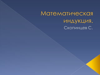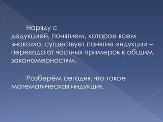Документ объясняет принципы математической индукции как метод доказательства утверждений о натуральных числах. Приводятся примеры применения индукции для решения задач, включая раскраску плоскости и количество рукопожатий. В конце рассматриваются ошибки в рассуждениях и дополнительная информация о методах индукции.