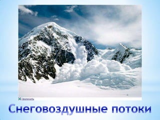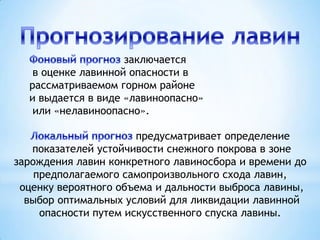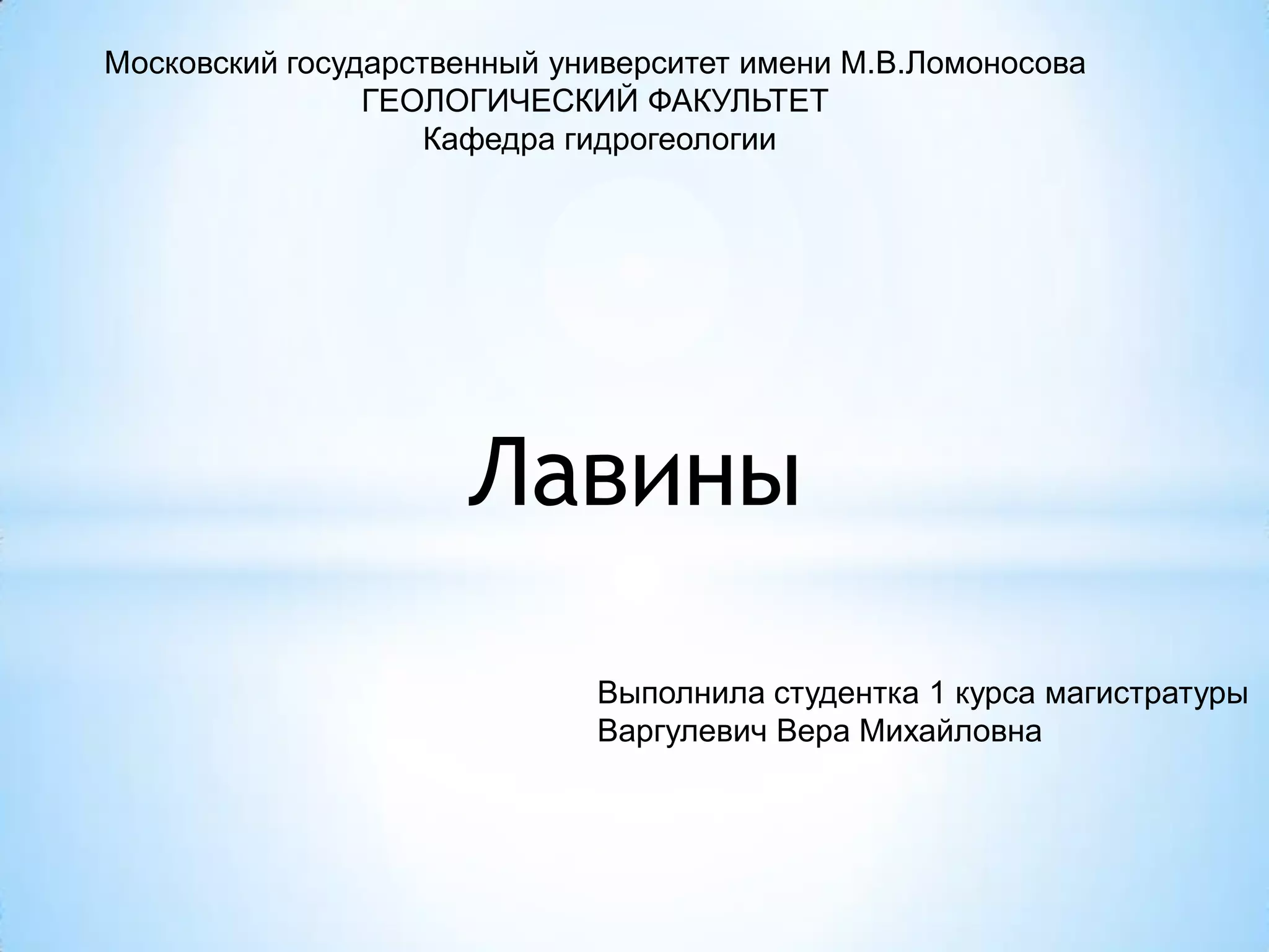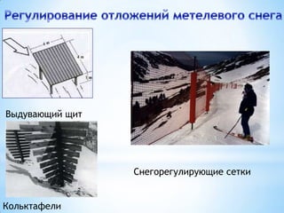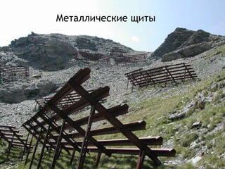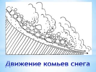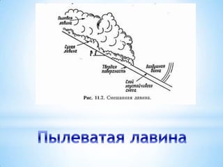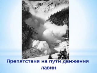 Документ представляет собой исследование лавинной опасности, выполненное студенткой Московского государственного университета. Описываются процессы формирования лавин, методы оценки их опасности и средства защиты от лавин, такие как металлические и деревянные щиты. Цель исследования заключается в определении устойчивости снежного покрова и оптимизации условий для ликвидации лавинной опасности.