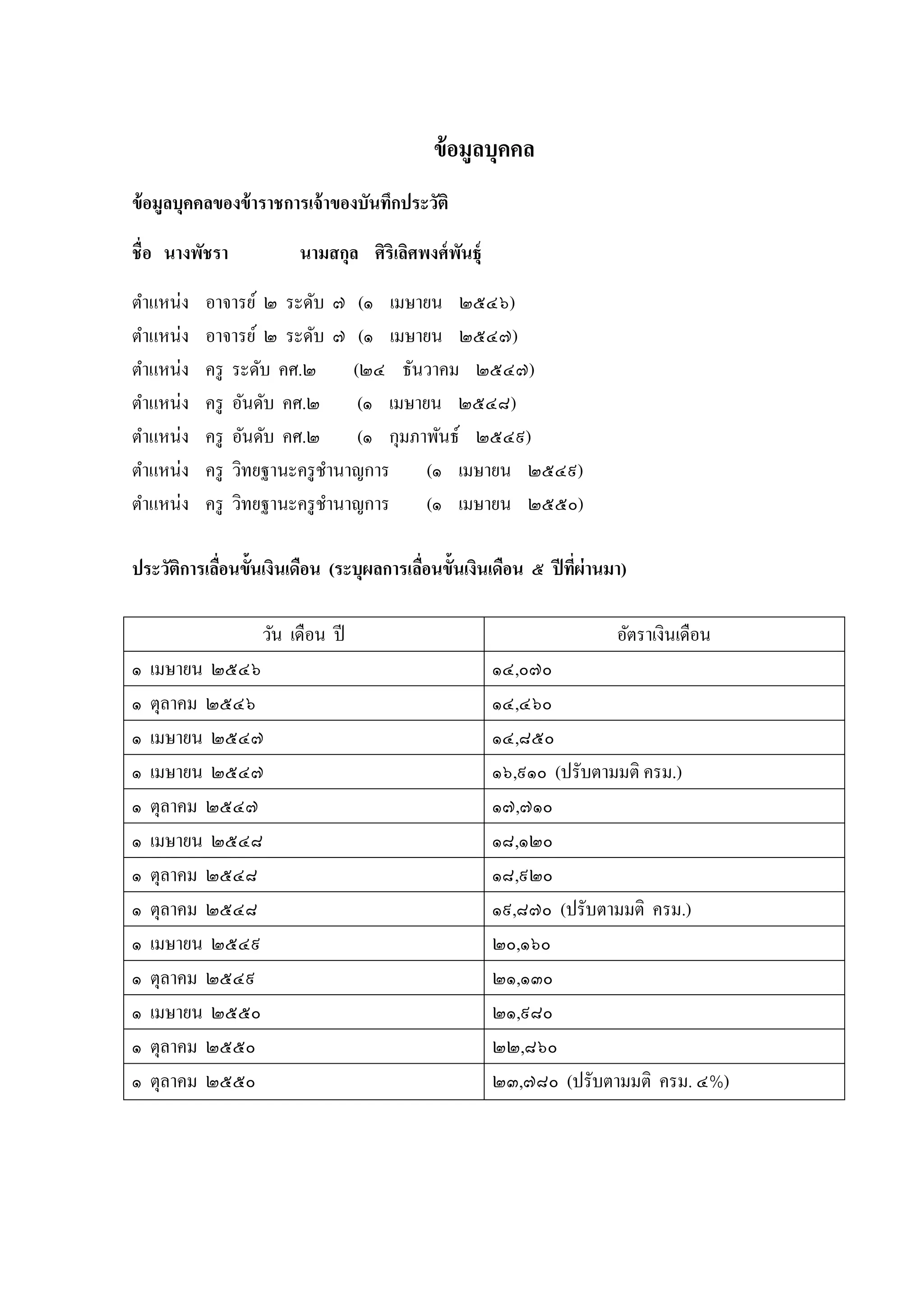 าราชการเจ้ าของบันทึกประวัติ ชื่อ นางพัชรา ตำแหน่ง ตำแหน่ง ตำแหน่ง ตำแหน่ง ตำแหน่ง ตำแหน่ง ตำแหน่ง นามสกุล ศิริเลิศพงศ์ พนธุ์ ั อำจำรย์ ๒ ระดับ ๗ (๑ เมษำยน ๒๕๔๖) อำจำรย์ ๒ ระดับ ๗ (๑ เมษำยน ๒๕๔๗) ครู ระดับ คศ.๒ (๒๔ ธันวำคม ๒๕๔๗) ครู อันดับ คศ.๒ (๑ เมษำยน ๒๕๔๘) ครู อันดับ คศ.๒ (๑ กุมภำพันธ์ ๒๕๔๙) ครู วิทยฐำนะครู ชำนำญกำร (๑ เมษำยน ๒๕๔๙) ครู วิทยฐำนะครู ชำนำญกำร (๑ เมษำยน ๒๕๕๐) ประวัติการเลือนขั้นเงินเดือน (ระบุผลการเลือนขั้นเงินเดือน ๕ ปี ทีผ่านมา) ่ ่ ่ วัน เดือน ปี ๑ ๑ ๑ ๑ ๑ ๑ ๑ ๑ ๑ ๑ ๑ ๑ ๑ เมษำยน ๒๕๔๖ ตุลำคม ๒๕๔๖ เมษำยน ๒๕๔๗ เมษำยน ๒๕๔๗ ตุลำคม ๒๕๔๗ เมษำยน ๒๕๔๘ ตุลำคม ๒๕๔๘ ตุลำคม ๒๕๔๘ เมษำยน ๒๕๔๙ ตุลำคม ๒๕๔๙ เมษำยน ๒๕๕๐ ตุลำคม ๒๕๕๐ ตุลำคม ๒๕๕๐ อัตรำเงินเดือน ๑๔,๐๗๐ ๑๔,๔๖๐ ๑๔,๘๕๐ ๑๖,๙๑๐ (ปรับตำมมติ ครม.) ๑๗,๗๑๐ ๑๘,๑๒๐ ๑๘,๙๒๐ ๑๙,๘๗๐ (ปรับตำมมติ ครม.) ๒๐,๑๖๐ ๒๑,๑๓๐ ๒๑,๙๘๐ ๒๒,๘๖๐ ๒๓,๗๘๐ (ปรับตำมมติ ครม. ๔%)