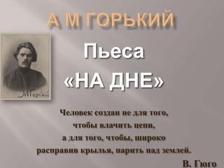 Пьеса «На дне» Максима Горького, написанная в начале 1900-х годов, изображает жизнь обитателей ночлежного дома для бездомных, среди которых царят алкоголь, нищета и философские размышления о человеческой природе. Главными темами произведения являются сломленность людей, отброшенных обществом, и непрестанная борьба за самоуважение и внутреннюю свободу. В пьесе отсутствует традиционное действие и конфликт, вместо этого представлены откровения персонажей, которые заставляют задуматься о жизненных ценностях и моральных принципах.