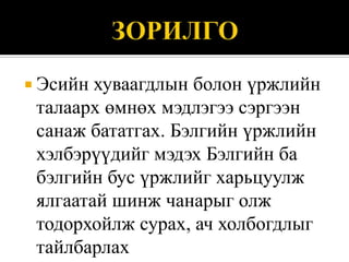 үржлийн талаарх өмнөх мэдлэгээ сэргээн санаж бататгах. Бэлгийн үржлийн хэлбэрүүдийг мэдэх Бэлгийн ба бэлгийн бус үржлийг харьцуулж ялгаатай шинж чанарыг олж тодорхойлж сурах, ач холбогдлыг тайлбарлах