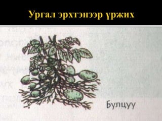 хэлбэр ургамалд ө ргөн тархсан Ургамлын биеийн х эсгүүд болох үндэслэг иш, булцуу , үндэс, навчаар нь бие даасан ургамал төрүүлэхийг хэлнэ.