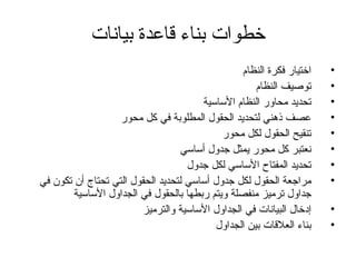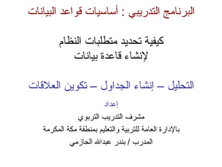 يتناول البرنامج التدريبي أساسيات قواعد البيانات، بدءًا من تحديد متطلبات النظام إلى إنشاء الجداول وتكوين العلاقات بينها. يشمل أيضًا خطوات بناء قاعدة بيانات لنظام التدريب مع تحديد الحقول والمفاتيح الأساسية لكل جدول وآلية الربط بين الجداول. يتضمن البرنامج أنشطة جماعية لفحص وتصنيف البيانات المطلوبة وتكوين العلاقات اللازمة لتحقيق أهداف النظام.
