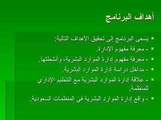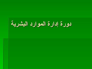 تتناول الوثيقة أهداف دورة إدارة الموارد البشرية، والتي تشمل فهم مفاهيم الإدارة وإدارة الموارد البشرية وعلاقتها بالتنظيم الإداري. كما تشرح وظائف الإدارة والموارد البشرية بما في ذلك التخطيط والتنظيم والاستقطاب وتقييم الأداء. وتتناول أيضًا التحديات التي تواجه إدارة الموارد البشرية مثل العولمة والجودة.