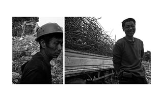 拾荒者,安徽人,表兄弟。金属探测器800元,进场费每日3 0元,每日卖废铁收入百元。 工地厨娘,四川人,为取出水泥块上的一根价值几毛钱的钢筋,挥锤2 0分钟。