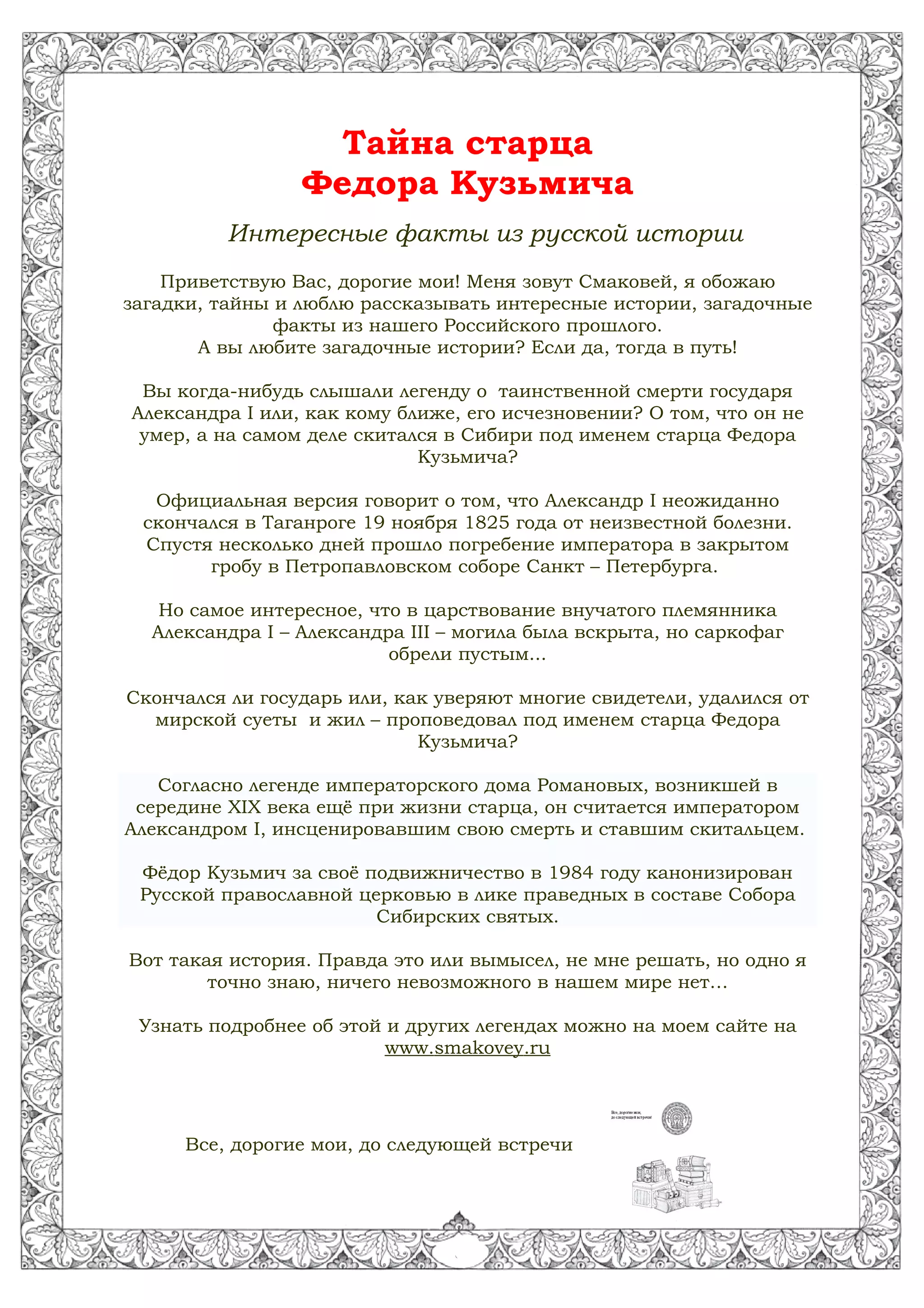 Документ обсуждает легенду о таинственной смерти императора Александра I, предполагая, что он инсценировал свою смерть и жил под именем старца Фёдора Кузьмича. Автор, Смаковей, делится интересными фактами и загадками российской истории, подчеркивая канонизацию Фёдора Кузьмича Русской православной церковью. Темы, затрагиваемые в тексте, вызывают размышления о реальности и вымысле в истории.